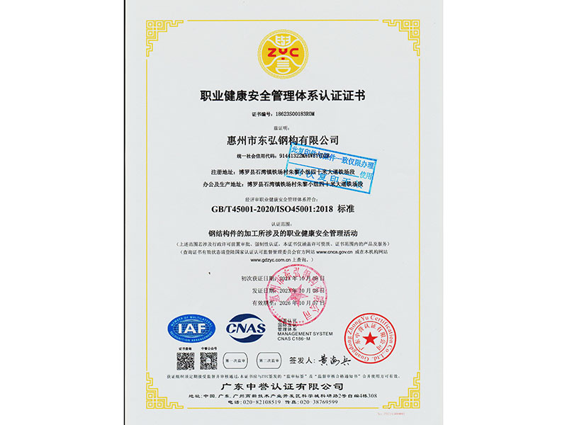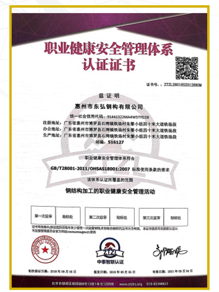 职业健康安全管理体系认证证书