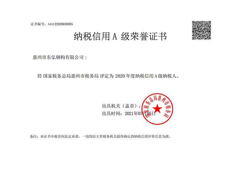 纳税信用A级荣誉证书